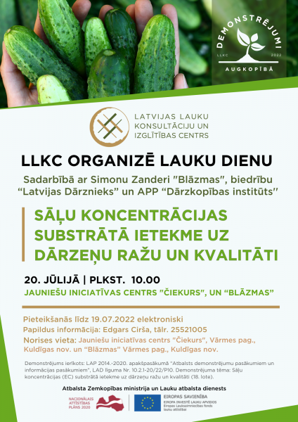 LLKC sadarbībā ar Simonu Zanderi ("Blāzmas", Vārmes pagasts, Kuldīgas novads), biedrību “Latvijas Dārznieks” un APP “Dārzkopības institūts” 20. jūlijā aicina apmeklēt lauka dienu “Sāļu koncentrācijas substrātā ietekme uz dārzeņu ražu un kvalitāti”.