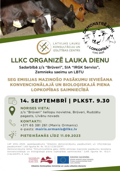 LLKC sadarbībā z/s “Brūveri”, SIA “IRGK Serviss”, Zemnieku saeimu un LBTU aicina apmeklēt demonstrējuma lauka dienu piensaimniecībā par siltumnīcefekta gāzu (SEG) emisiju mazinošo pasākumu ieviešanu konvencionālajā un bioloģiskajā piena lopkopības saimniecībā.