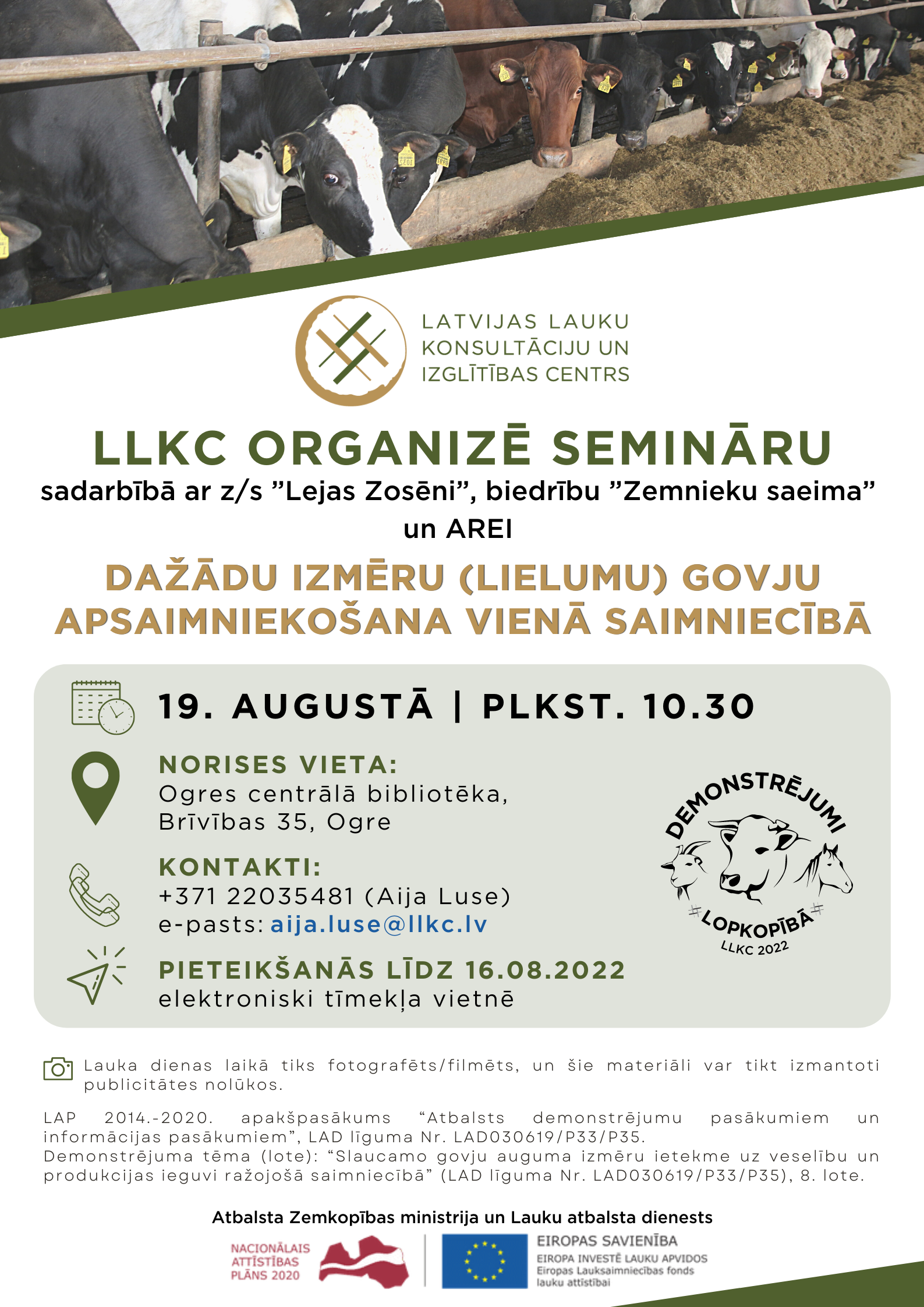 LLKC sadarbībā ar z/s ”Lejas Zosēni”, biedrību ”Zemnieku saeima” un AREI aicina 19. augustā apmeklēt demonstrējumu noslēguma semināru par dažādu izmēru (lielumu) govju apsaimniekošanu vienā saimniecībā.