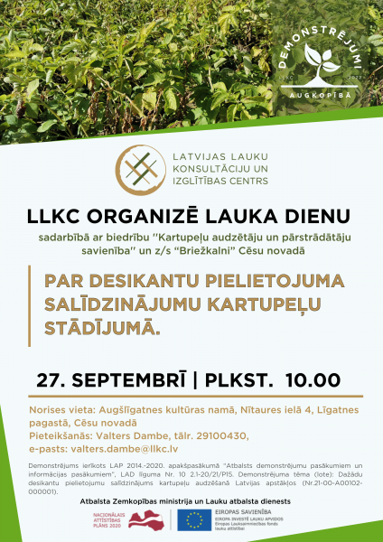 LLKC sadarbībā ar biedrību ''Kartupeļu audzētāju un pārstrādātāju savienība'' un z/s “Briežkalni” Cēsu novadā aicina apmeklēt demonstrējuma lauka dienu par desikantu pielietojuma salīdzinājumu kartupeļu stādījumā.