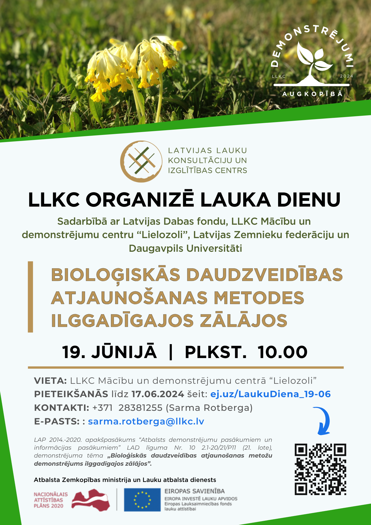 Lai demonstrētu un izvērtētu ilggadīgo zālāju bioloģiskās daudzveidības atjaunošanas metodes, Latvijas Lauku konsultāciju un izglītības centrs sadarbībā ar Latvijas Dabas fondu, LLKC Mācību un demonstrējumu centru “Lielozoli”, Latvijas Zemnieku federāciju un Daugavpils Universitāti aicina apmeklēt lauka dienu.