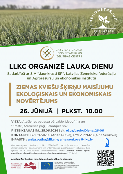 LLKC sadarbībā ar SIA “Jaunkrasti SP" (Atašienes pagasts, Jēkabpils novads), Latvijas Zemnieku federāciju un Agroresursu un ekonomikas institūtu aicina apmeklēt lauka dienu „Ziemas kviešu šķirņu maisījumu ekoloģiskais un ekonomiskais novērtējums”.