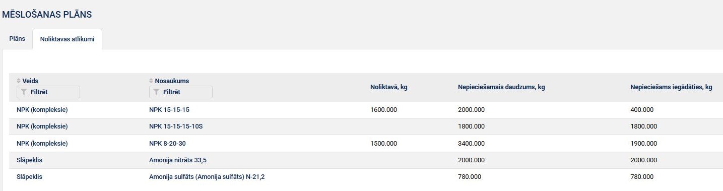 Pēc mēslošanas plāna izveides cilnē “Noliktavas atlikumi” tiek sniegts kopsavilkums par saplānotajiem mēslošanas līdzekļiem, to nepieciešamo daudzumu, esošo atlikumu noliktavā un papildu daudzumu, kas jāiegādājas. Šī informācija ļauj ērti plānot nepieciešamos pirkumus, balstoties uz izveidoto mēslošanas plānu.