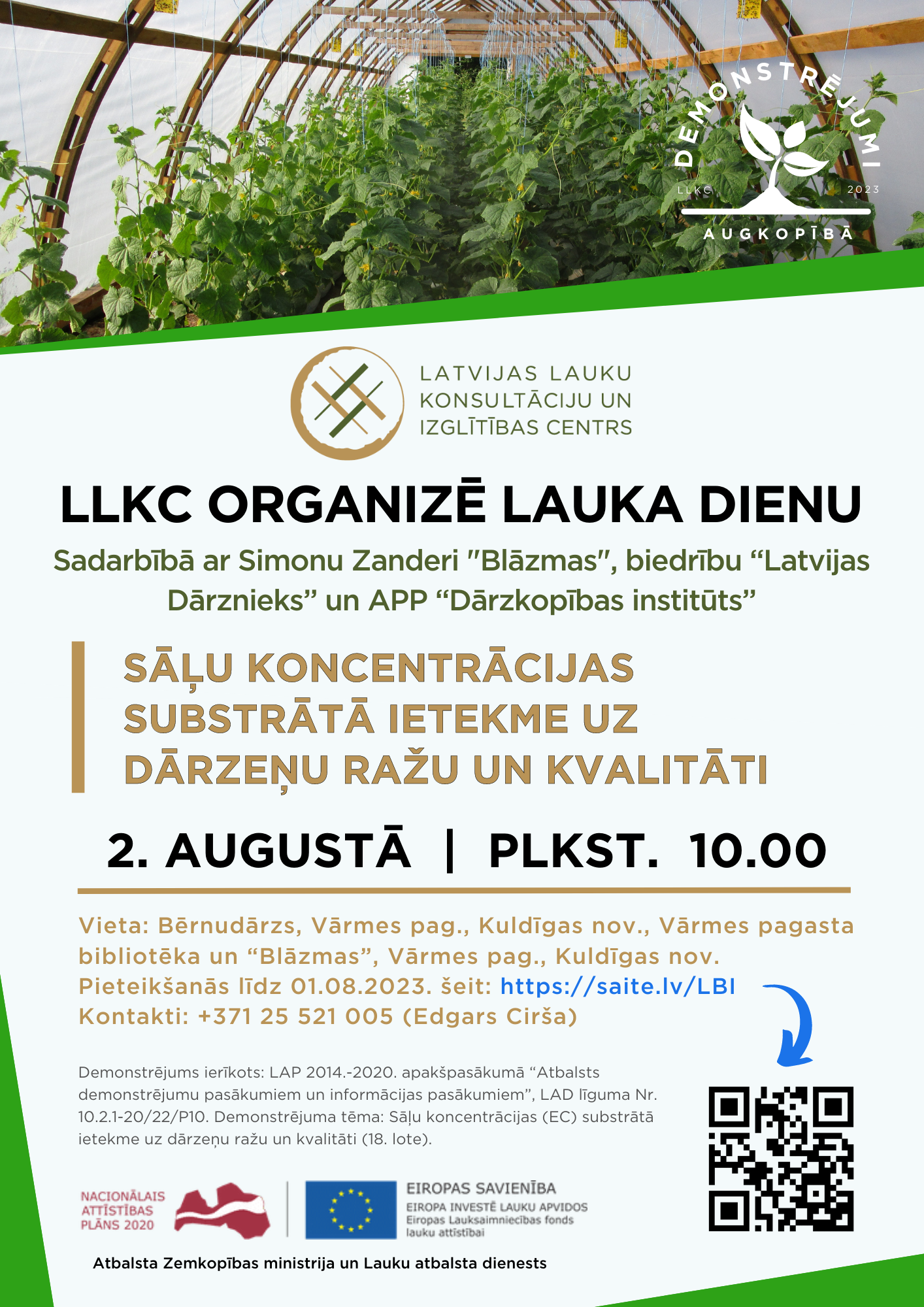 LLKC sadarbībā ar Simonu Zanderi ("Blāzmas", Vārmes pagasts, Kuldīgas novads), biedrību “Latvijas Dārznieks” un APP “Dārzkopības institūts” 2. augustā aicina apmeklēt lauka dienu “Sāļu koncentrācijas substrātā ietekme uz dārzeņu ražu un kvalitāti”.