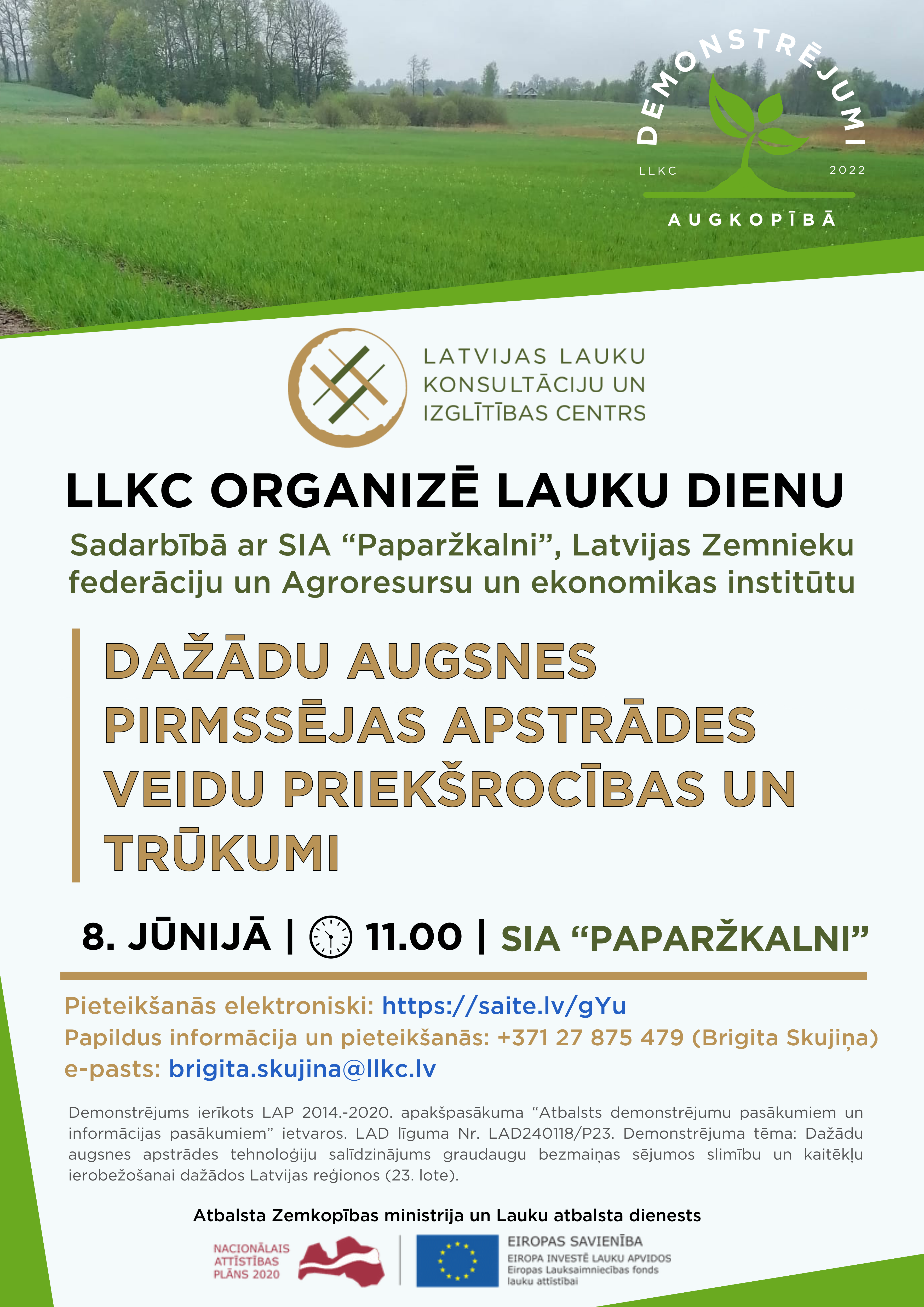 LLKC sadarbībā ar SIA “Paparžkalni”, Latvijas Zemnieku federāciju un Agroresursu un ekonomikas institūtu aicina 8.  jūnijā apmeklēt demonstrējuma lauka dienu par dažādu augsnes apstrādes tehnoloģiju salīdzinājumu graudaugu bezmaiņas sējumos slimību un kaitēkļu ierobežošanai.