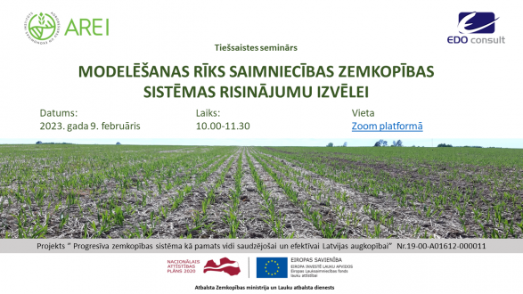 2023. gada 9. februārī no 10.00-11.30, Zoom platformā notiks Agroresursu un ekonomikas institūts (AREI) un SIA “Edo Consult” tiešsaistes seminārs, kurā informēs par projekta ”Progresīva zemkopības sistēma kā pamats vidi saudzējošai un efektīvai Latvijas augkopībai” (Nr.19-00-A01612-000011) laikā izveidoto modelēšanas rīku zemkopības sistēmas izvēlei.