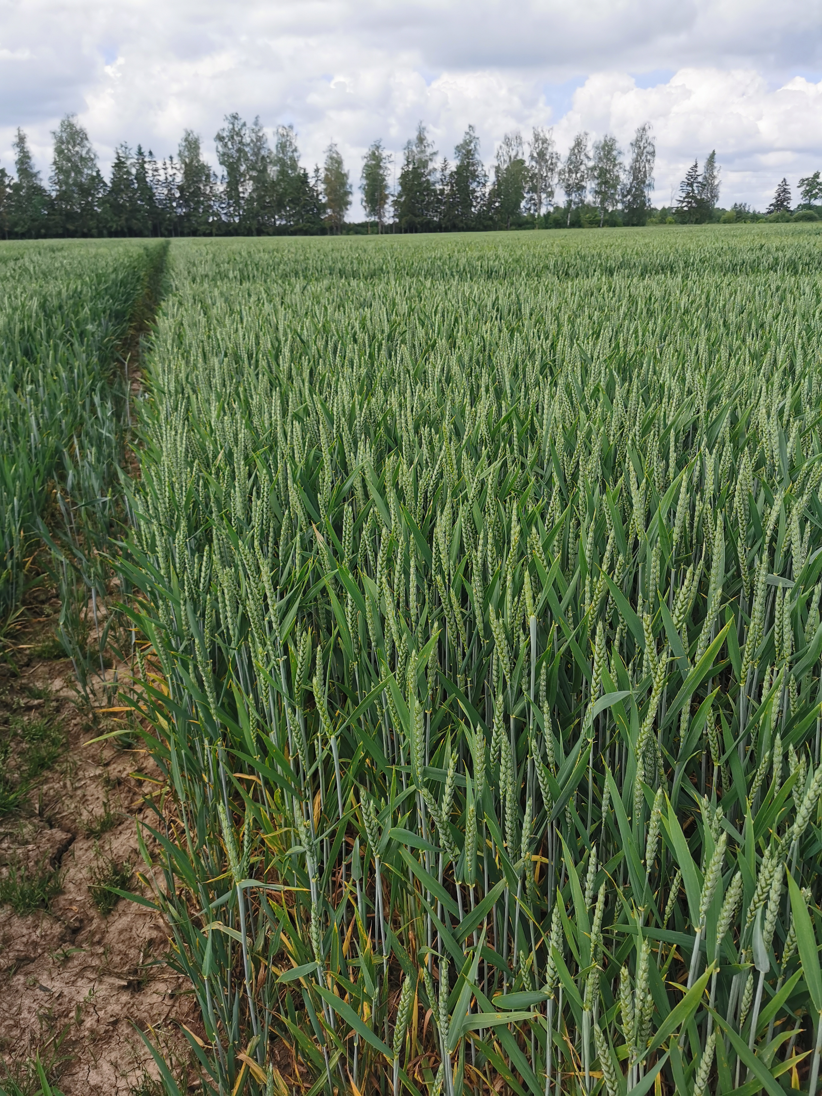 Alūksnes novada Mālupes pagasta z/s “Kadiķi M.A.” ziemas kviešu ‘Skagen’ sēja veikta 20.09.2023. ar izsējas normu 240 kg/ha. Augsne smilšmāla ar vidēju fosfora un kālija saturu, pH 5,4, organiskā viela 5,3%. Pirms sējas rugāju lauks nodiskots un nokaļķots ar Nordkalk 200 kg/ha, priekšaugs ziemas rapsis. Veikta mēslošanas līdzekļu lietošana atbilstoši variantiem (1. tabula).