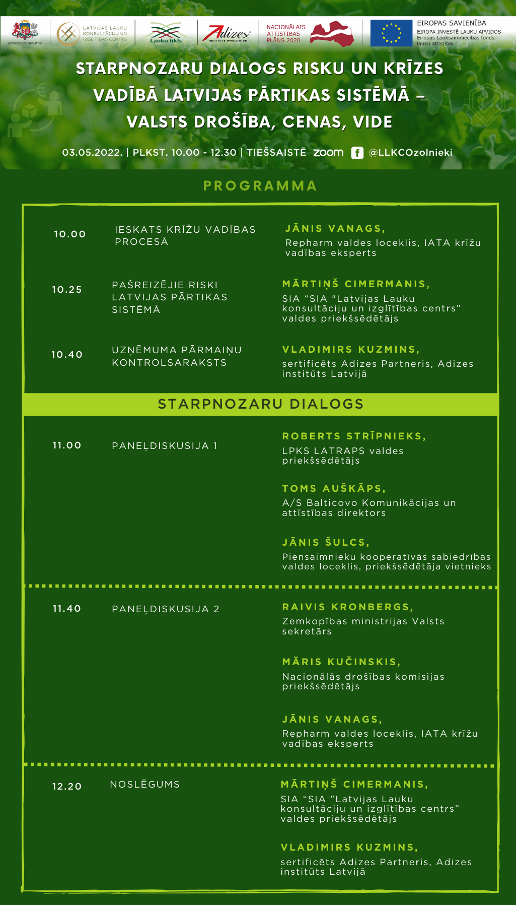 Reaģējot uz situāciju pasaulē, LLKC sadarbībā ar ZM un Adizes institūtu Pārtikas dialoga ietvaros 3. maijā organizē nacionālu starpnozaru dialogu par risku un krīzes vadību Latvijas pārtikas sistēmā – valsts drošība, cenas, vide. Diskusiju atklās IATA krīžu vadības eksperts Jānis Vanags.